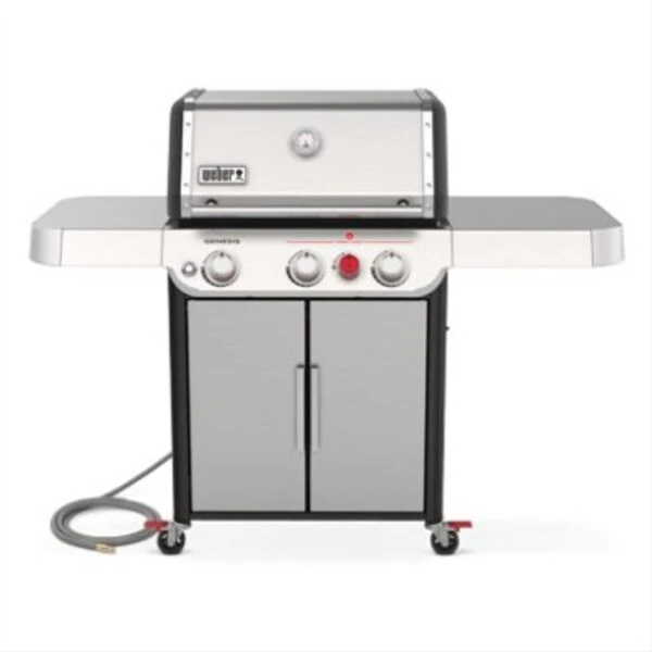 Weber Genesis S325s stainless steel natural gas grill GS4 grilling system includes easy start infinity ignition, 3 stainless steel burners that provide 39,000 BTU, stainless steel flavorizer bars that add the smokey flavor and the grease management system which helps reduce flareups Sear station burner provides 13,000 BTU 07mm stainless steel cooking grates provide 513 sq in of cooking space, secondary cooking area adds 274 sq in 2 stainless steel side tables and the right side is larger to provide more room for prep The taller porcelain enamel lid with builtin thermometer Stainless steel heat deflectors The enclosed cart is great for storage Four metal locking casters for ease of moving 10 ft flexible natural gas hose includedAssembled dimensions 485 inH x 62 inW x 27 inD