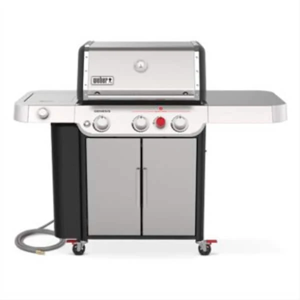 Weber Genesis S 335 stainless steel natural gas grill GS4 grilling system includes easy start infinity ignition, 3 stainless steel burners that provide 39,000 BTU, stainless steel flavorizer bars that add the smokey flavor, the grease management system which helps reduce flareups Sear station burner provides 13,000 BTU Side burner provides 12,000 BTU 07mm stainless steel cooking grates provide 513 sq in of cooking space, secondary cooking area adds 274 sq in Accomodates outdoor grilling system sold separately 2 stainless steel side tables and the right side is larger to provide more room for prep Taller porcelain enamel lid with builtin thermometer Stainless steel heat deflectors The enclosed cart is great for storage and there is an easy access storage under the left side table Four metal locking casters 10 ft flexible natural gas hose included Assembled dimensions 48 inH x 62 inW x 27 inD
