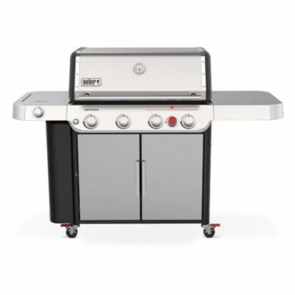 Weber GenesisS435 stainless steel LP gas grill GS4 grilling system includes easy start infinity ignition, 4 SS burners provide 48,000 BTU, stainless steel flavorizer bars add the smokey flavor, Grease management system helps reduce flareups Sear station burner provides 13,000 BTU Side burner provides 12,000 BTU 07mm stainless steel grates provide 646 sq in of cooking space, secondary cooking area adds 348 sq in Accommodates outdoor grilling system sold separately SS side tables right side is larger to provide more room for prep Taller porcelain enamel lid with builtin thermometer Enclosed cart is great for storage and there is an easy access storage under the left side table Four metal locking casters Assembled dimensions 485 inHx685 inWx27 inD