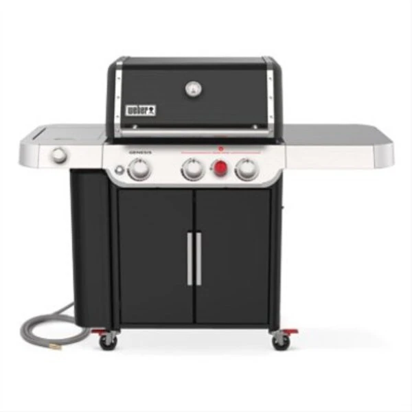 Weber Genesis SP E335 black natural gas grill GS4 grilling system includes easy start infinity ignition, 3 stainless steel burners that provide 39,000 BTU, stainless steel flavorizer bars that add the smokey flavor, the grease management system which helps reduce flareups Sear station burner provides 13,000 BTU Side burner provides 12,000 BTU 09mm stainless steel cooking grates provide 513 sq in of cooking space, secondary cooking area adds 274 sq in Accomodates outdoor grilling system sold separately 2 stainless steel side tables and the right side is larger to provide more room for prep Motion sensored LED lights in lid light entire grilling surface Taller porcelain enamel lid with builtin thermometer Stainless steel heat deflectors The enclosed cart is great for storage and there is an easy access storage under the left side table Four metal locking casters 10 ft natural gas hose included Assembled dimensions 48 inH x 62 inW x 27 in