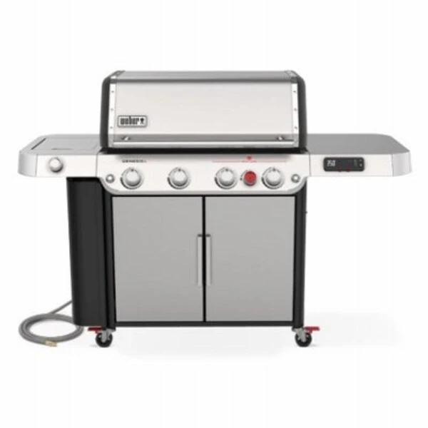 Weber Genesis SPX435 SS natural gas grill Smart Tech integration monitors grill temperature, sends notifications to your smart phone and comes with 2 probe capacity GS4 grilling system includes easy start infinity ignition, 4 SS burners provide 48,000 BTU, SS flavorizer bars add the smokey flavor, Grease management system helps reduce flareups Sear station burner provides 13,000 BTU Side burner provides 12,000 BTU 07mm SS grates provide 646 sq in of cooking space, secondary cooking area adds 348 sq in Accommodates outdoor grilling system sold separately Motion censored lights in lid lightup grilling surface Backlit control knobs SS side tables right side is larger to provide more room for prep Taller porcelain enamel lid with builtin thermometer Enclosed cart is great for storage and there is an easy access storage under the left side table Four metal locking casters 10 ft NG hose included Assembled dimensions 485 inHx685 inWx27 inD
