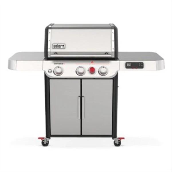 Weber Genesis SX325s stainless steel LP gas grill Smart Tech integration monitors grill temperature, sends notifications to your smart phone and comes with two probe capacity GS4 grilling system includes easy start infinity ignition, 3 stainless steel burners that provide 39,000 BTU, stainless steel flavorizer bars that add the smokey flavor and the grease management system which helps reduce flareups Sear station burner provides 13,000 BTU 07mm stainless steel cooking grates provide 513 sq in of cooking space, secondary cooking area adds 274 sq in 2 stainless steel side tables and the right side is larger to provide more room for prep The taller porcelain enamel lid with builtin thermometer Stainless steel heat deflectors The enclosed cart is great for storage Four metal locking casters for ease of movingAssembled dimensions 485 inH x 62 inW x 27 inD