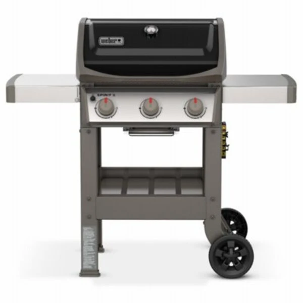 Weber Spirit II E310 black LP gas grill GS4 grilling system includes easy start infinity ignition, 3 stainless steel burners that provide 30,000 BTU, porcelain enamel flavorizer bars that add the smokey flavor and the grease management system which helps reduce flareups 2 porcelain enameled cast iron cooking grates provide 424 sq in of cooking space, warming rack adds 105 sq in 2 stainless steel side tables have tool hooks and the left one folds down Electric crossover ignition system allows for starting with one push of a button The open cart is great for storage contains fuel gauge and 2 large wheels Temporary reduction in MAP Holiday from 525 to 714 See MOL for reduction and partial reimbursement instructions