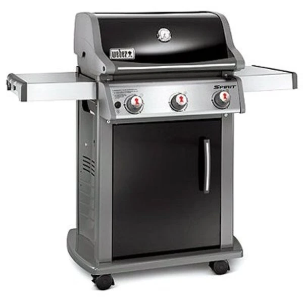 Weber Spirit E310 black LP gas grill Porcelain enamel cast iron cooking grates provide 424 sq in of cooking space and the warming rack adds another 105 sq in 3 stainless steel burners provide 32,000 BTU Porcelain enameled Flavorizer bars add the smokey flavor Porcelain enamel lid with builtin thermometer The 2 stainless steel side tables contain tool hooks The electronic crossover ignition easily lights burners Cleanup is easy with front access grease tray and catch pan Move grill easily on two front locking casters and to back swivel casters The enclosed steel cabinet stores the LP tank not included as well as the fuel gauge that helps monitor gas amount Temporary reduction in MAP Holiday from 525 to 714 See MOL for reduction and partial reimbursement instructions