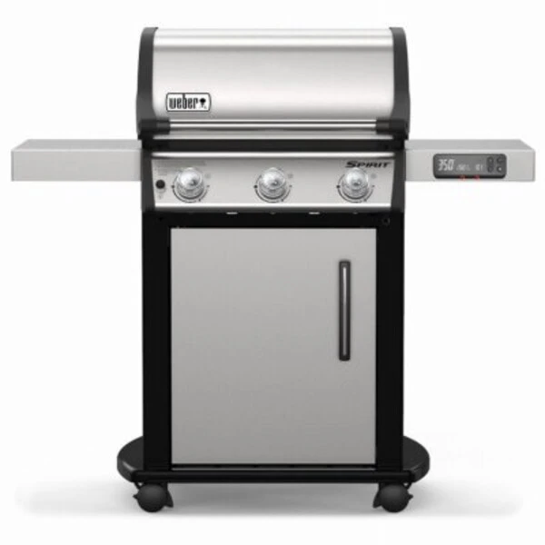 Weber Spirit SX315 stainless steel NG gas grill Smart Tech integration monitors grill temperature, sends notifications to your smart phone and comes with one meat probe and one ambient probe Porcelain enamel cast iron cooking grates provide 424 sq in of cooking space, 3 stainless steel burners that provide 32,000 BTU The stainless steel flavorizer bars that add the smokey flavor Easy start with the electronic crossover ignition Front access grease tray with catch pan 2 stainless steel side tables have chrome tool hooks Stainless steel lid with builtin thermometer The enclosed cart is great for storage and has 4 swivel casters front two lock into place 10 ft natural gas hose included Temporary reduction in MAP Holiday from 525 to 714 See MOL for reduction and partial reimbursement instructions