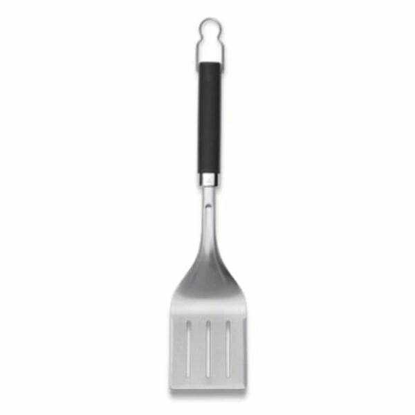 Weber, Stainless Steel, Precision grill spatula Soft touch handle allows for a comfortable nonslip grip Angled neck reaches over the grill to keep hands and arms away from heat Wide front edge provides support when flipping food